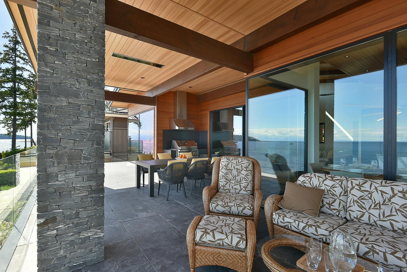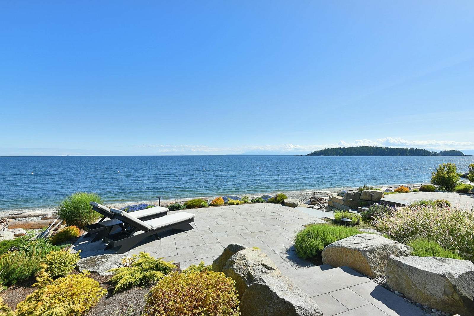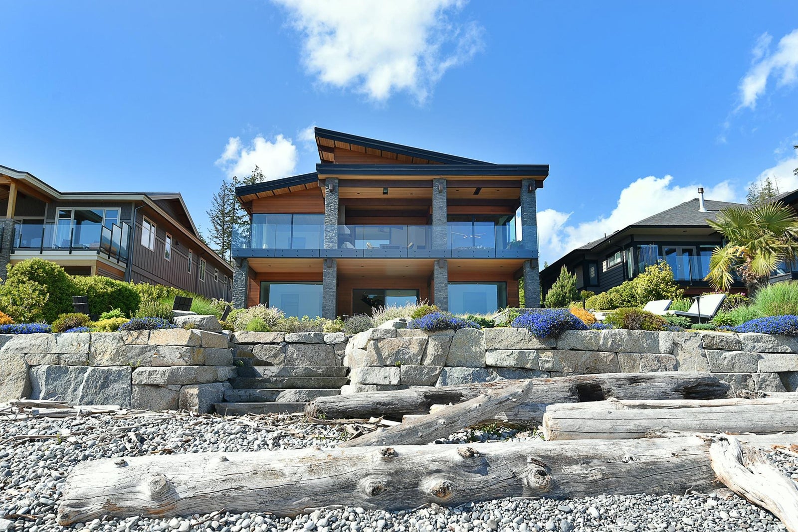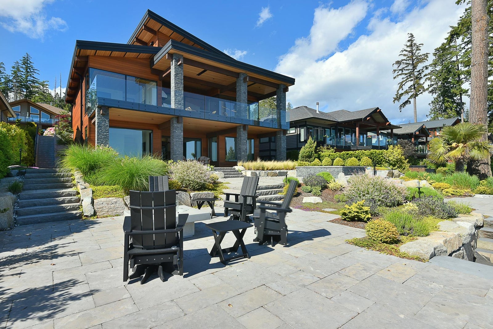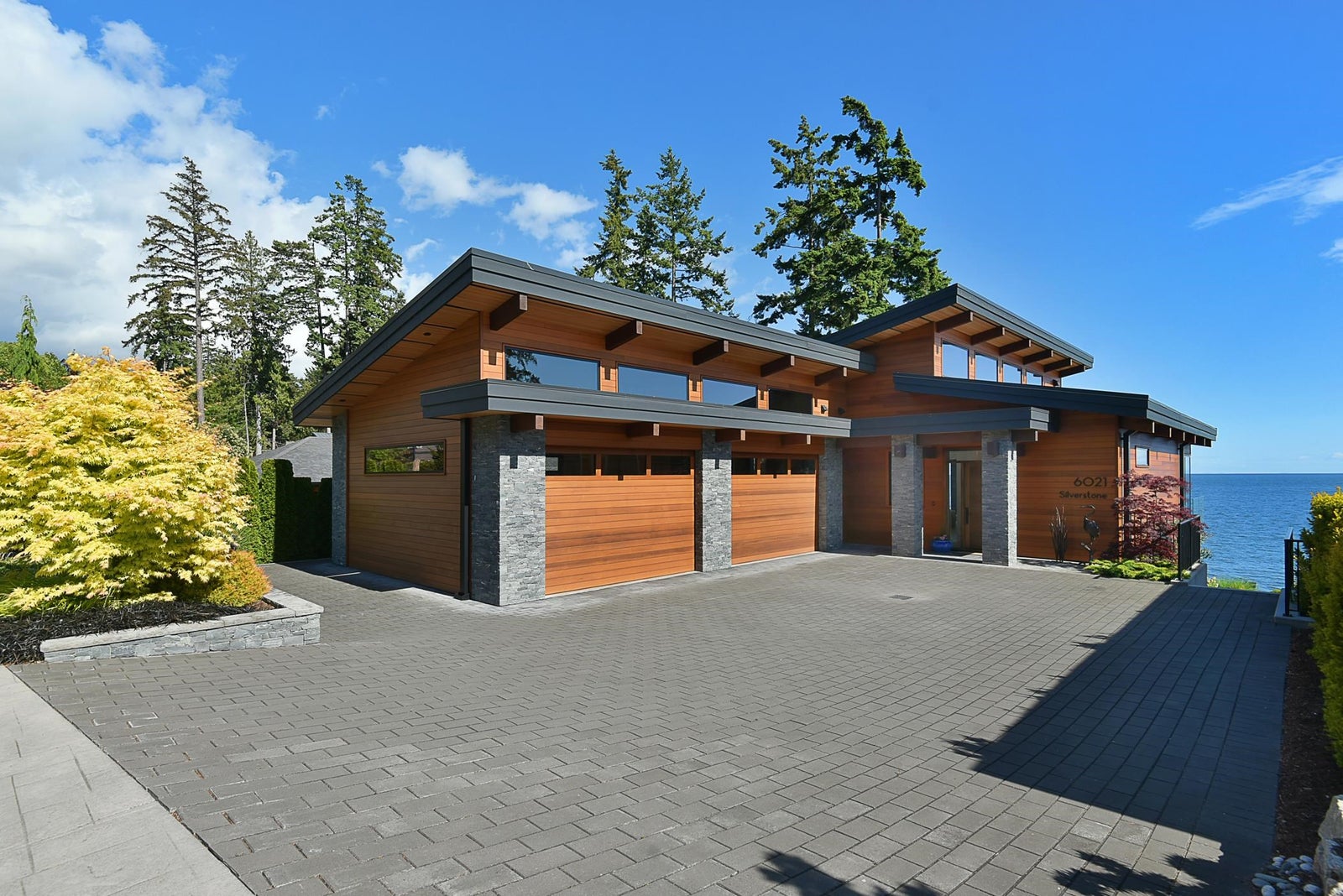 6021 Silver Stone Lane, architecturally designed and constructed by Dave Hutt fine homes. This stunning contemporary home exudes style, design, and attention to detail. Floor to ceiling windows and doors capture abundant natural light and enhance unparalleled views of Trail Bay and all 4 of the the Trail Islands. The primary bedroom with its beautiful windows place the view center stage, the primary bathroom is truly lovely. The kitchen living and dining room are open and expansive with high vaulted clear cedar ceilings with tasteful fir beams. Take the stairs or elevator to the lower floor, 2 large bedrooms with ensuite bathrooms and family room, Oceanside gardens & entertainment area with built in hot tub and one-of-a-kind gas fire pit easy access to the pebble beach for beach activities